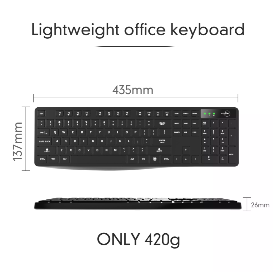 Le clavier UMILA Office dispose de 104 touches confortables (disposition AZERTY) et est parfait pour les utilisateurs à la recherche d'un clavier ultra fin et élégant. Profitez d'une expérience fluide et réactive grâce à son design haut de gamme et à ses indicateurs LED pour le verrouillage des chiffres, des majuscules et du défilement. Compatible avec les ordinateurs portables et de bureau Windows, il suffit de le connecter à votre appareil pour commencer à travailler.
